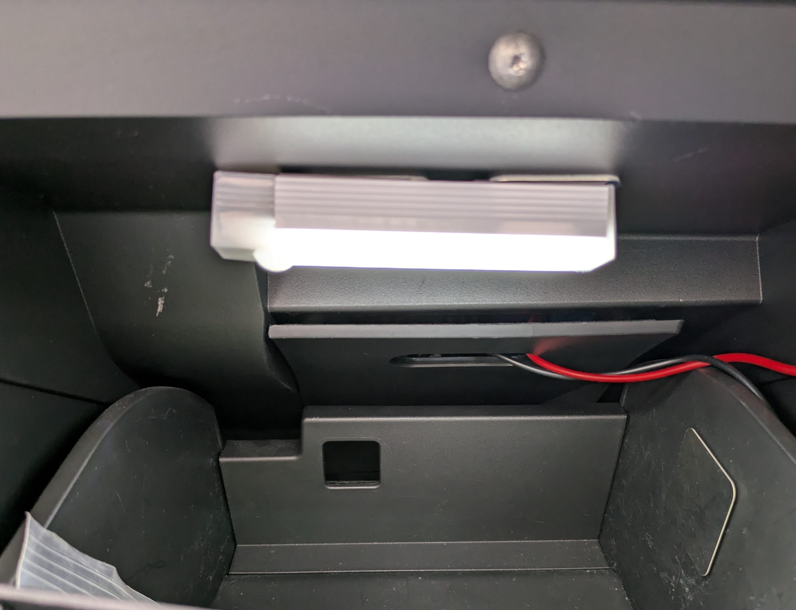 せっかくなので、グローブボックス内にもセンサーLEDライトを付けます。こちらは10cm。蓋をオープンした時に明るく照らしてくれるので、夜に移動ばかりしているワタシには助かります。